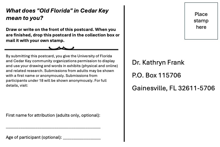We’re inviting residents of the Cedar Key and Rosewood communities, and visitors to Cedar Key, to share “What does Old Florida in Cedar Key mean to you?” Let us know in photos, drawings, or words! Submissions will become part of a community exhibit and contribute to qualitative research on the importance of cultural heritage and working waterfronts in small Gulf coast communities.